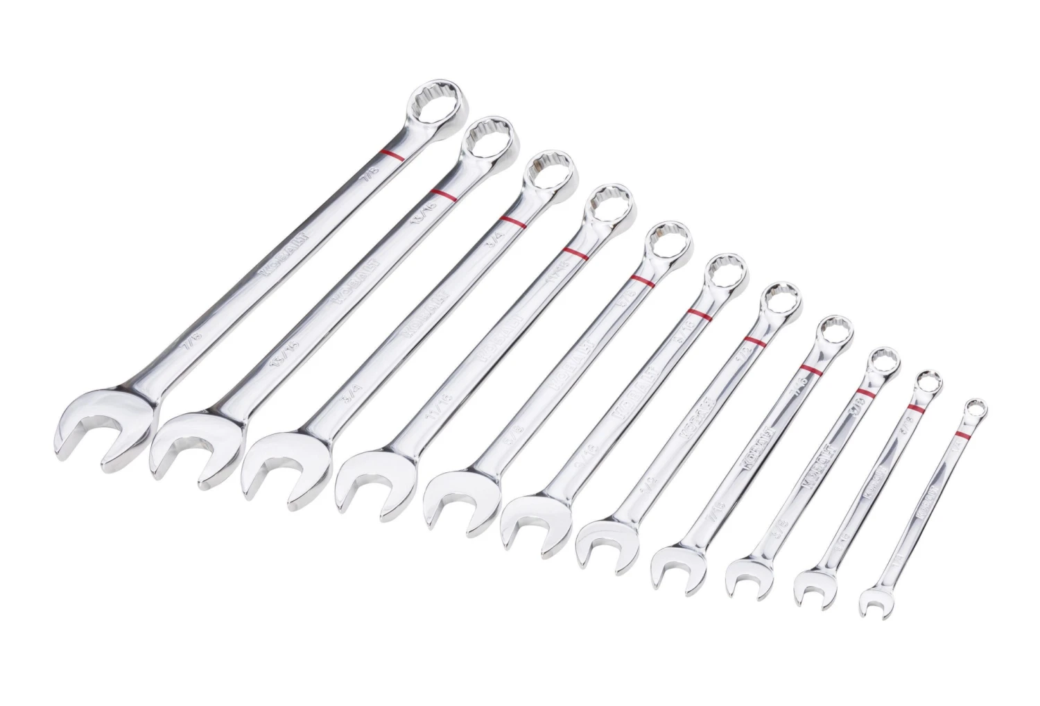 Kobalt’s 11-piece standard (SAE) combination wrench set includes 1/4, 5/16, 3/8, 7/16, 1/2, 9/16, 5/8, 11/16, 3/4, 13/16 and 7/8-in wrenches