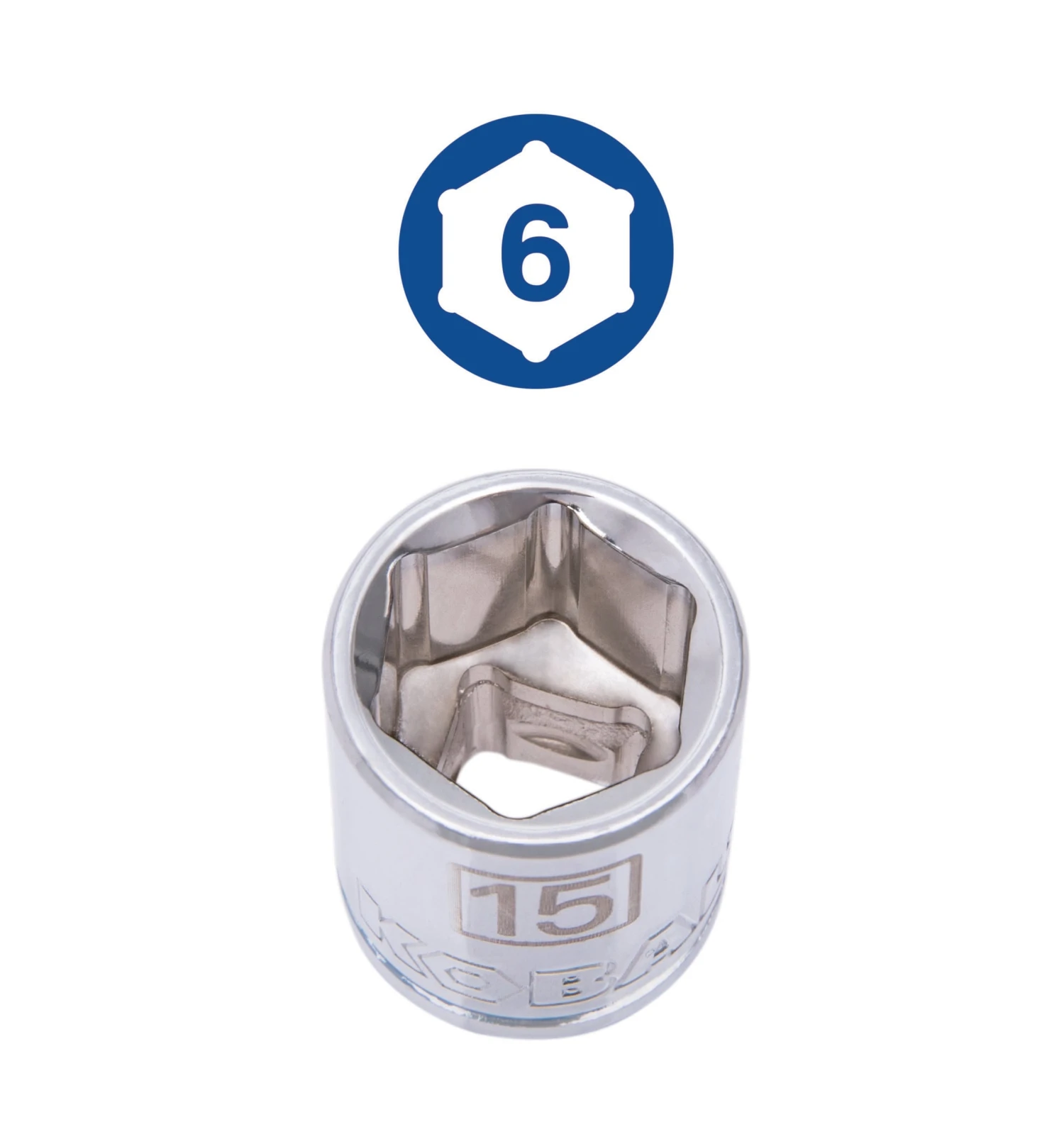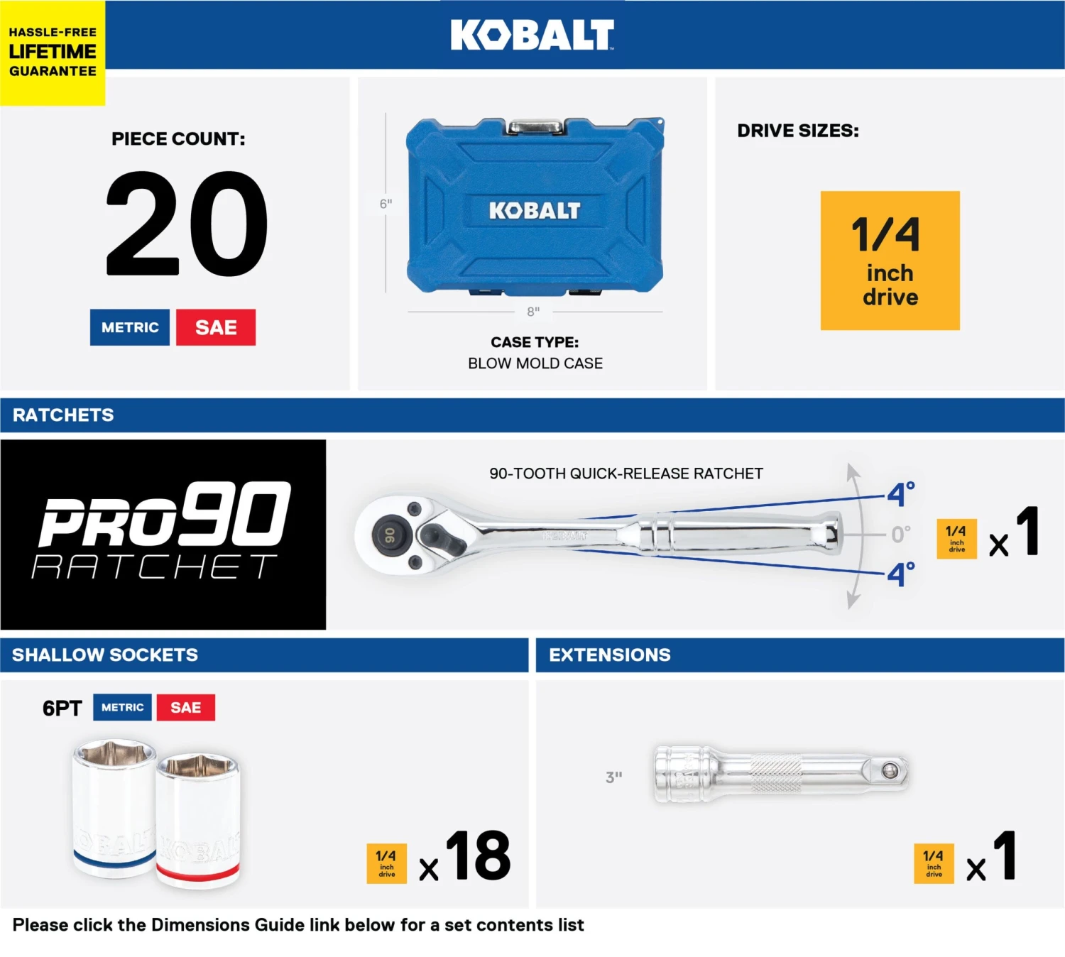 This 1/4-inch drive set contains 18 commonly used 6-point sockets, one ratchet and a 3-inch extension