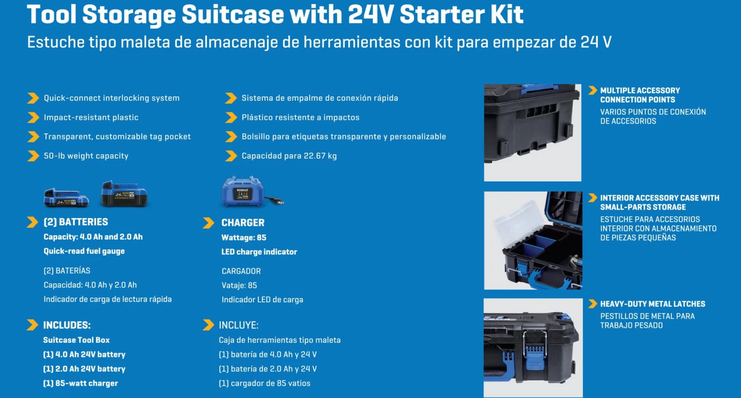 Kobalt’s 24-volt starter kit includes: a 2.0Ah battery, a 4.0Ah battery, an 85-Watt charger, and a CASESTACK storage box