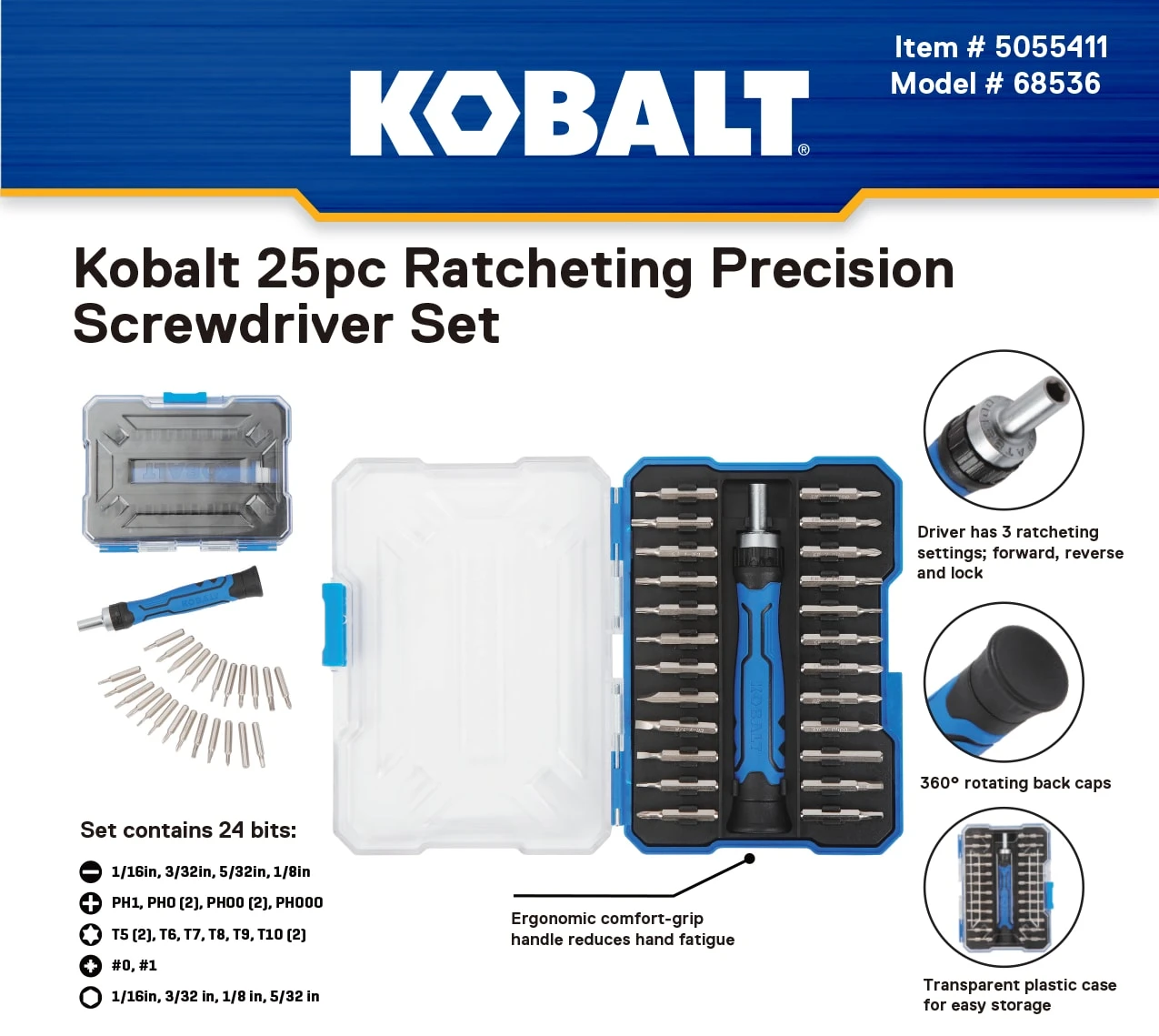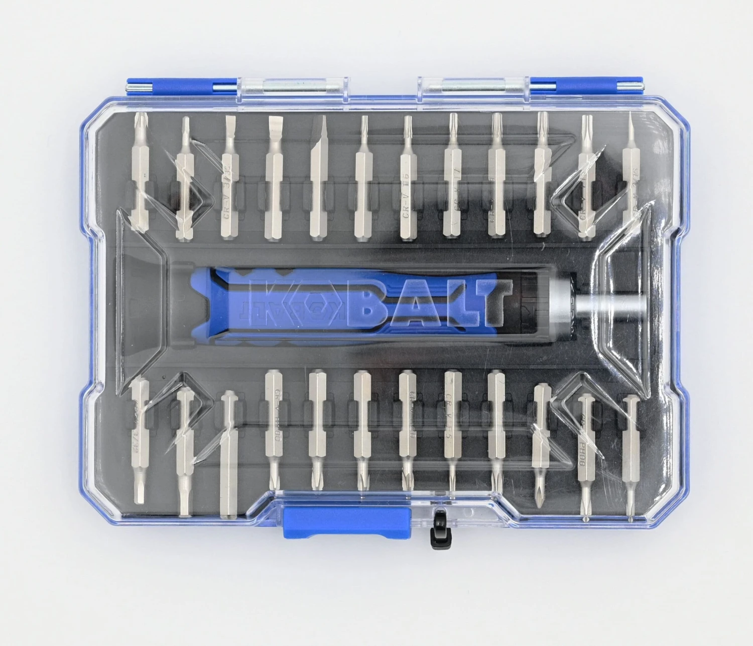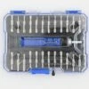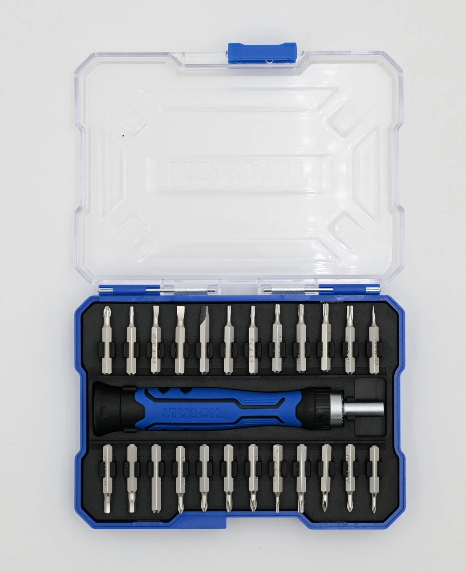 Includes: Phillips:#000, #00(2), #0(2), #1, Slotted:1/16 in, 3/32 in, 1/8 in, 5/32 in, Torx: T5(2), T6, T7, T8, T9, T10(2), Pz:#0, #1, Hex:1/16 in, 3/32 in, 1/8 in, 5/32 in