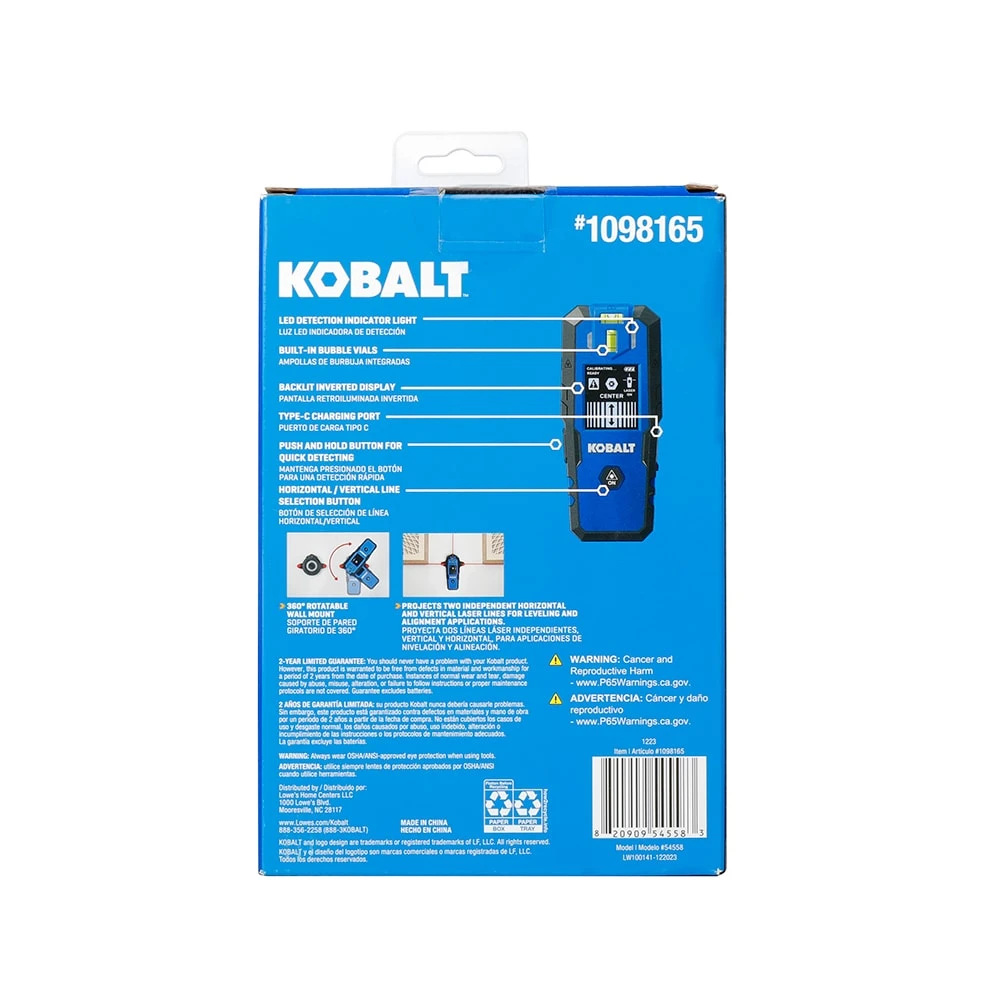 Transform your DIY projects with the Kobalt Rechargeable 2-in-1 Laser Level with Stud Finder. This versatile tool is your ultimate companion for precise layout and leveling needs on any wall surface. Equipped with a powerful stud finder, it effortlessly detects both wood and metal studs hidden behind your walls, while also identifying A/C wires for added safety. The dual-functionality doesn’t stop there—it projects two distinct, bright laser horizontal lines and one vertical line, providing precise alignment and leveling for your projects. The 360-degree rotatable magnetic wall mount, paired with two sturdy drywall pins, measuring and positioning become a breeze. With a rechargeable Li-ion battery and Type-C charging port, you’ll never have to worry about running out of power mid-project again. Elevate your layout and leveling game with the Kobalt Rechargeable 2-in-1 Laser Level with Stud Finder—your all-in-one solution for great results every time.