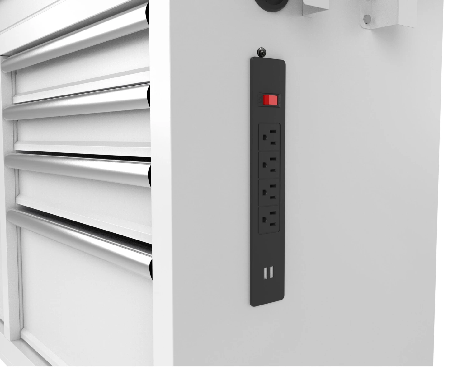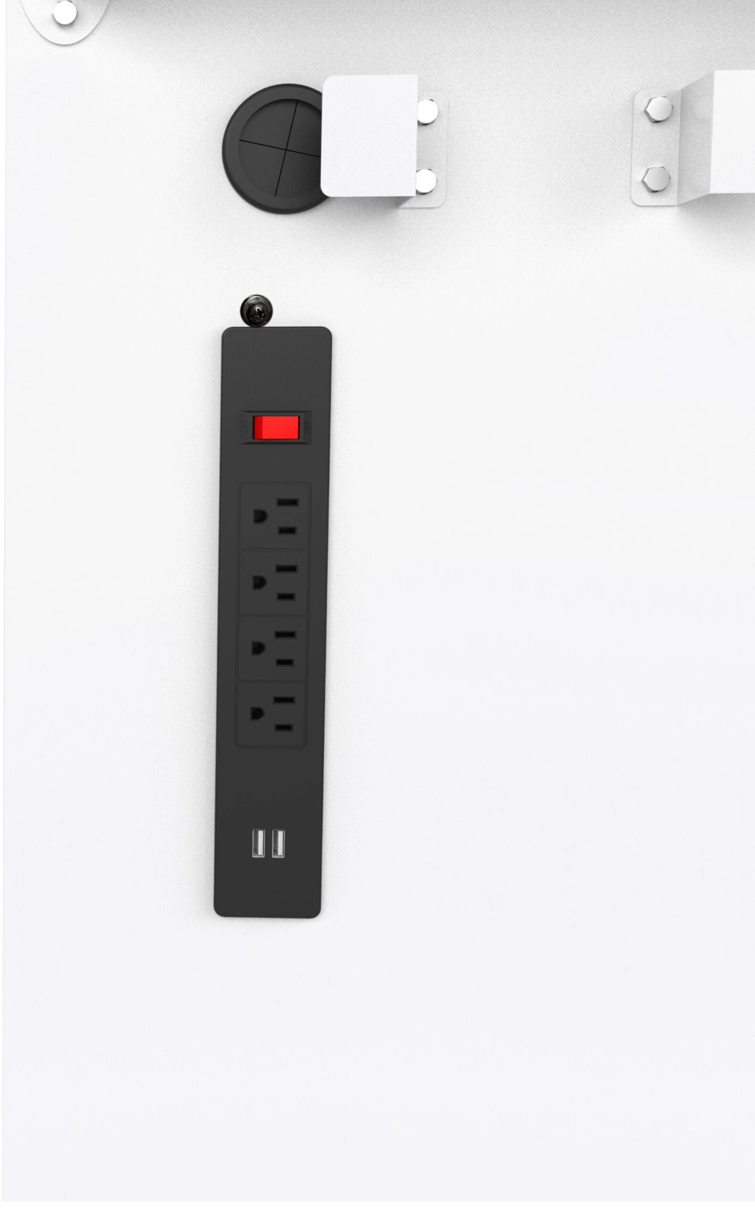 • Integrated power strip with 4-outlets and 2-USB ports for easy charging