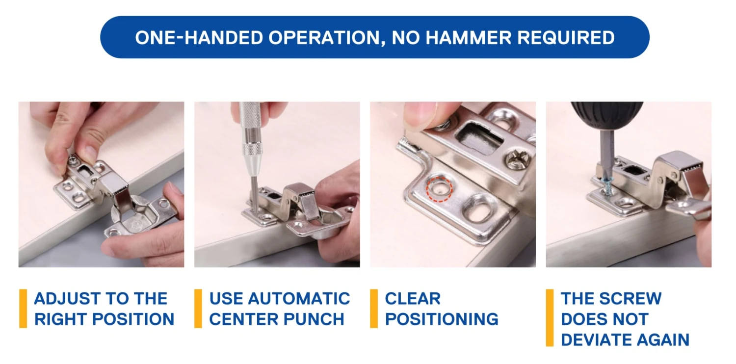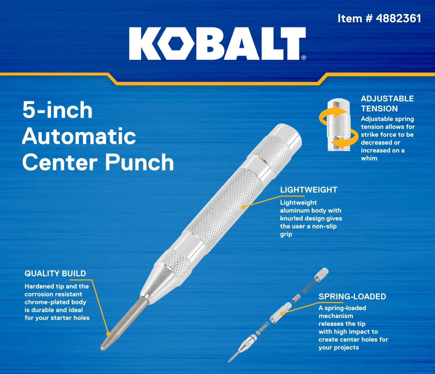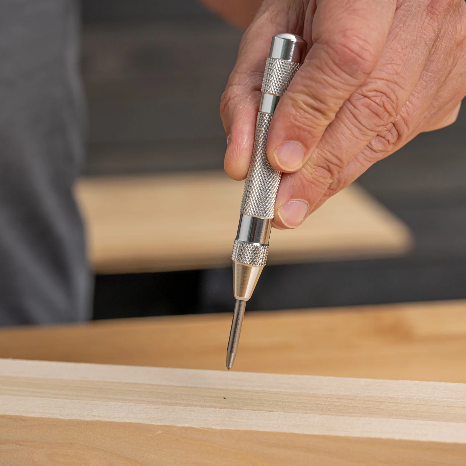 Accurate center punch prevents drill bit from traveling, starts drill, nail or screw holes