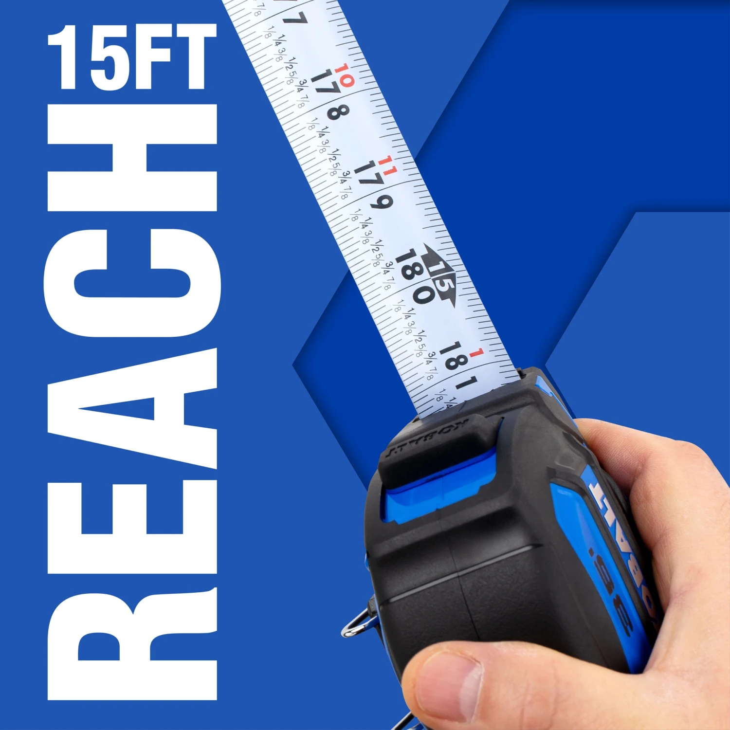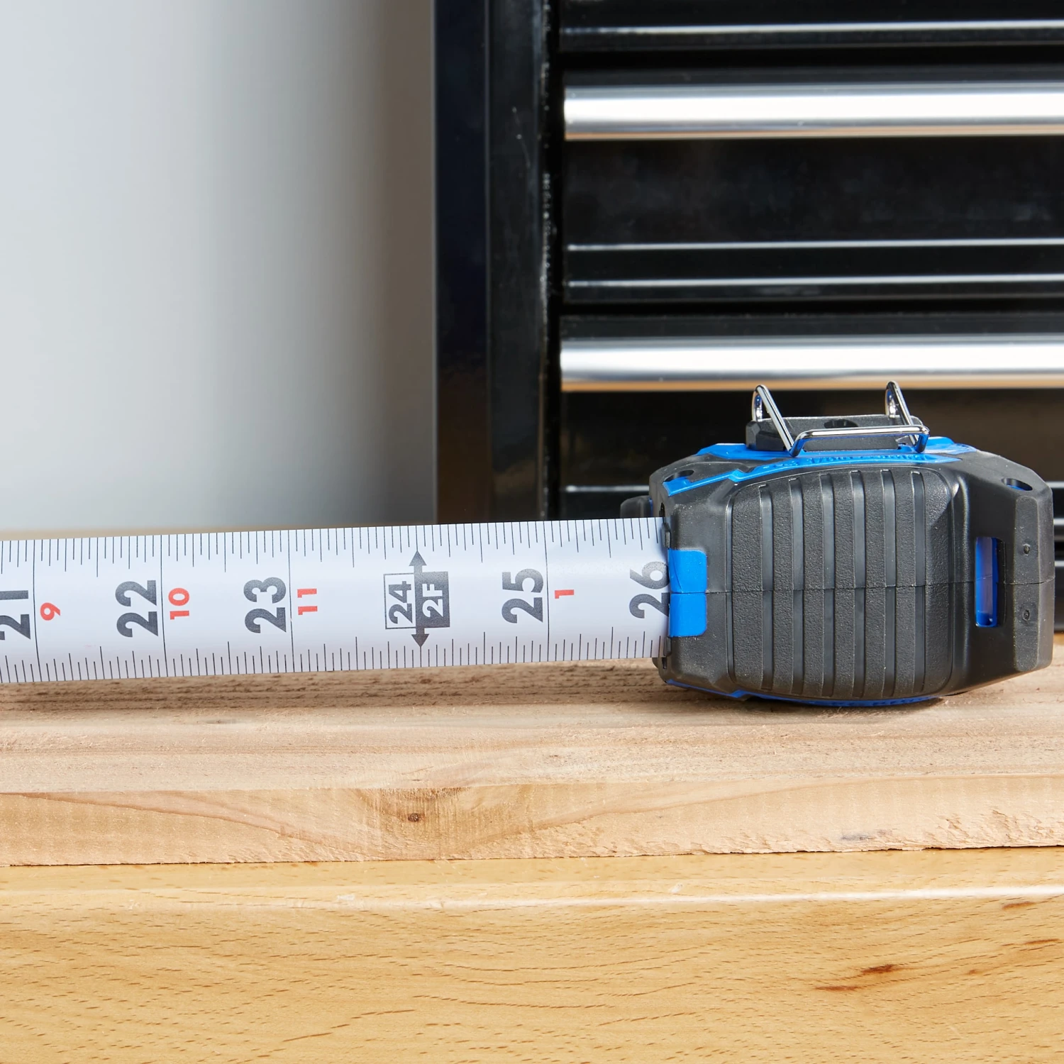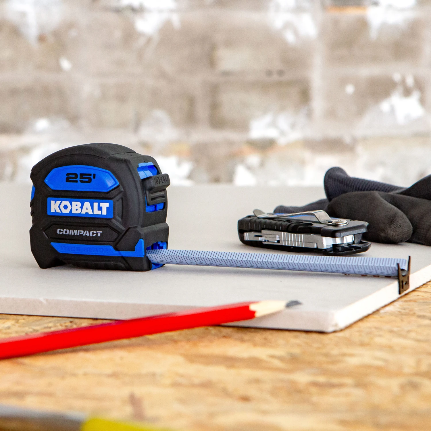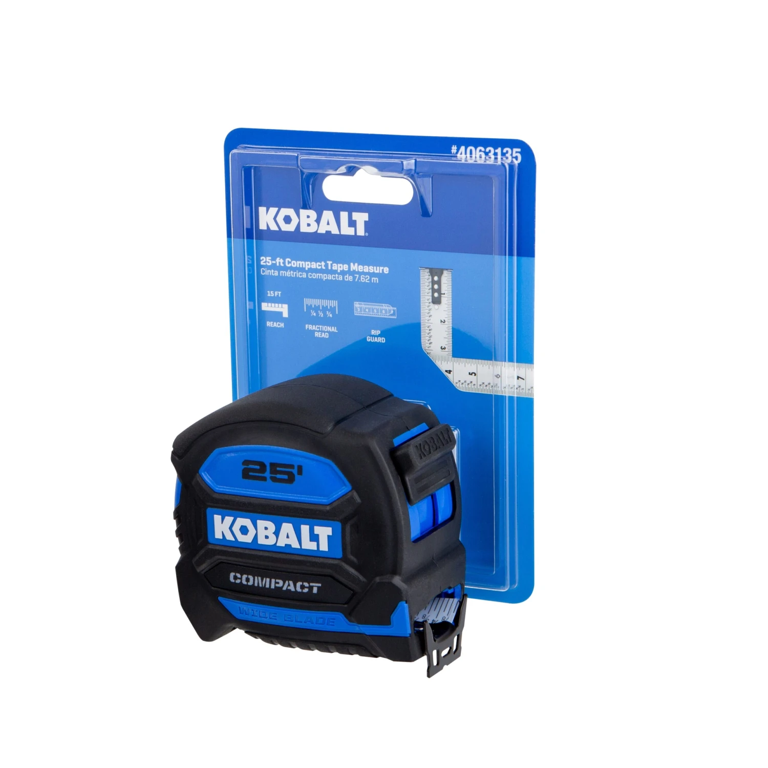 Kobalt wide blade tape measures are the most compact design wide blade tape measures in it’s class. The wide blade allows for a 15ft reach and 12ft of standout. It also comes equipped with a white non glare blade and backside printing for precise measurements in any environment.