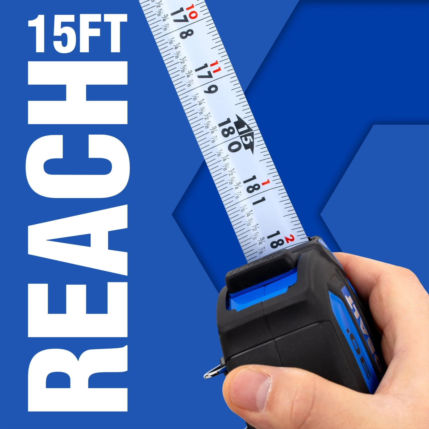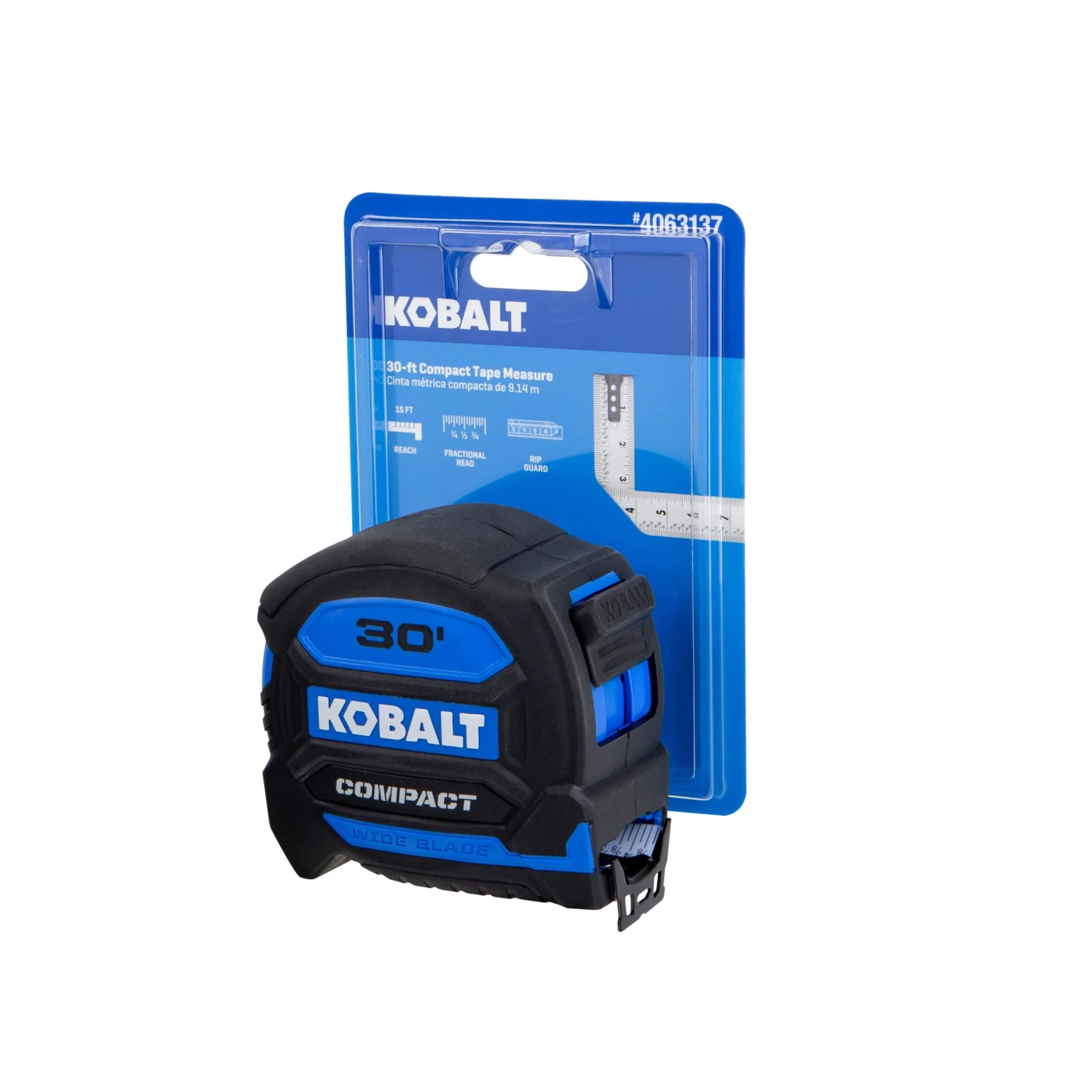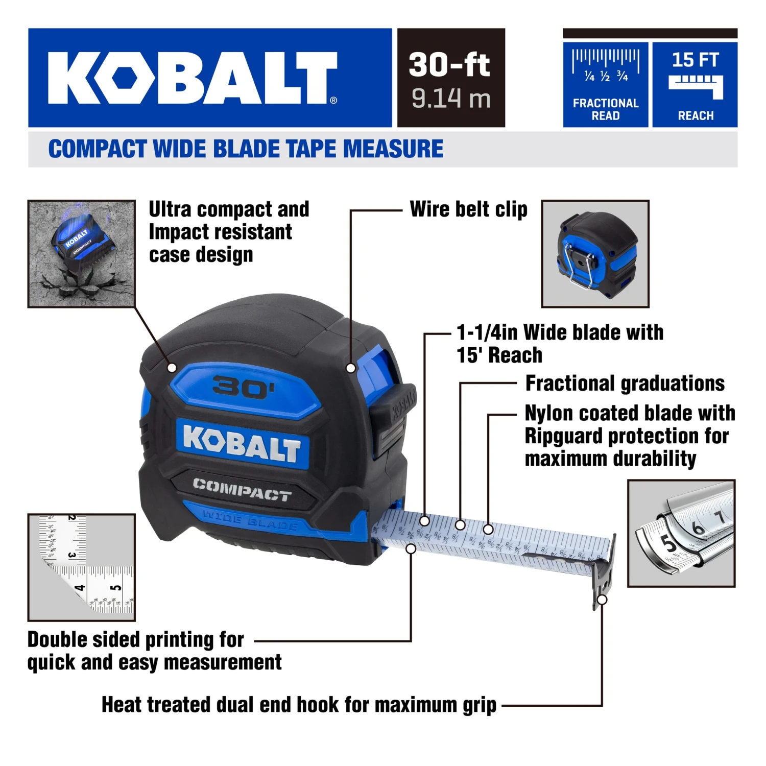Kobalt wide blade tape measures are the most compact design wide blade tape measures in it’s class. The wide blade allows for a 15ft reach and 12ft of standout. It also comes equipped with a white non glare blade and backside printing for precise measurements in any environment.