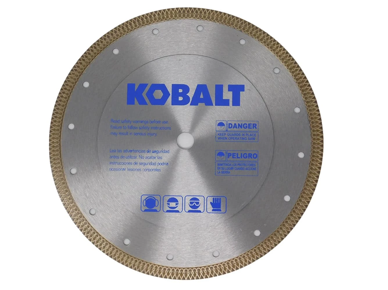 Kobalt’s latest innovation in tile cutting blades. This new 10” Kobalt turbo mesh blade is designed to provide the cleanest, smoothest cut ever. The with mesh diamond segments delivers high-quality cuts with minimal chipping. The turbo mesh pattern eliminates heat caused by friction resulting in the perfect cut. It has a reinforced steel core that prevents flexing, wobbling, and vibration during cutting for steady operation. Perfect for contractors and DIY for premium cuts on porcelain, granite, marble , and other natural stone. For use on 10” wet tile saws.