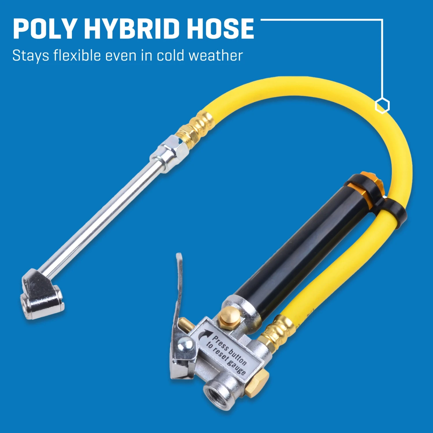 The poly hybrid inflation hose remains flexible even in cold conditions and features a clip-on chuck for convenient, one-handed operation