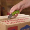 To change the blade, using your thumb nail, depress the blade locking level on top of the blade holder. Continue to apply pressure. With your other hand. Grip the sides of the blade and pull it away from the blade holder. Continue to hold the blade release lever. With the hand you just removed the old blade with, pick up a new blade and slide it back into place where you just took the old blade from. Release the locking lever and now the new blade is firmly locked in place.