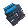 This carpenter’s pouch has multiple pockets and sleeves to hold nails and tools and includes a steel hammer holder.
